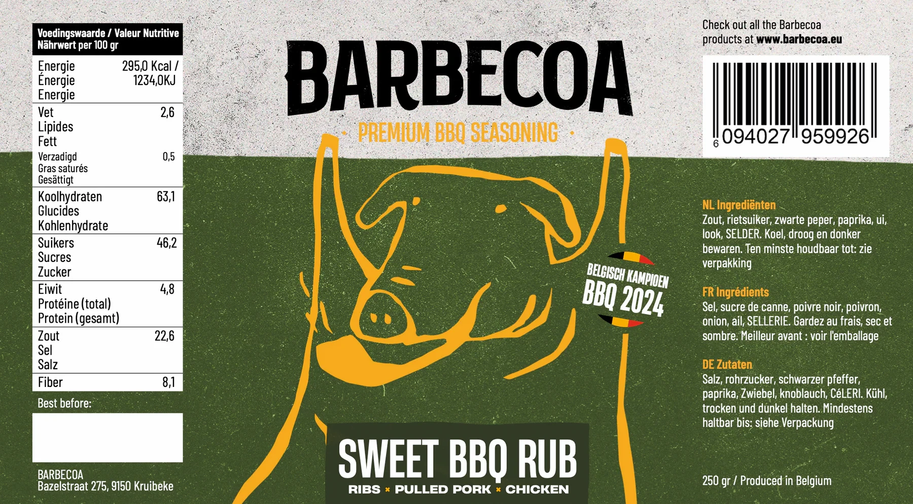 De Barbecoa Sweet BBQ Rub geeft vlees een zoete en kruidige barbecue smaak. Ideaal voor low en slow bereidingen zoals ribs, pork belly en pulled pork. Door de suiker ontstaat tijdens het garen een mooie gekarameliseerde bark. Geschikt voor kamado barbecue, keramische BBQ en buiten koken.