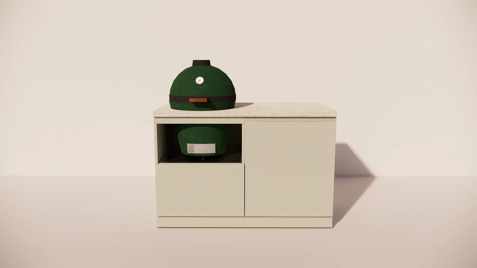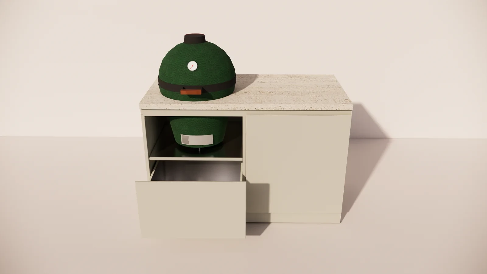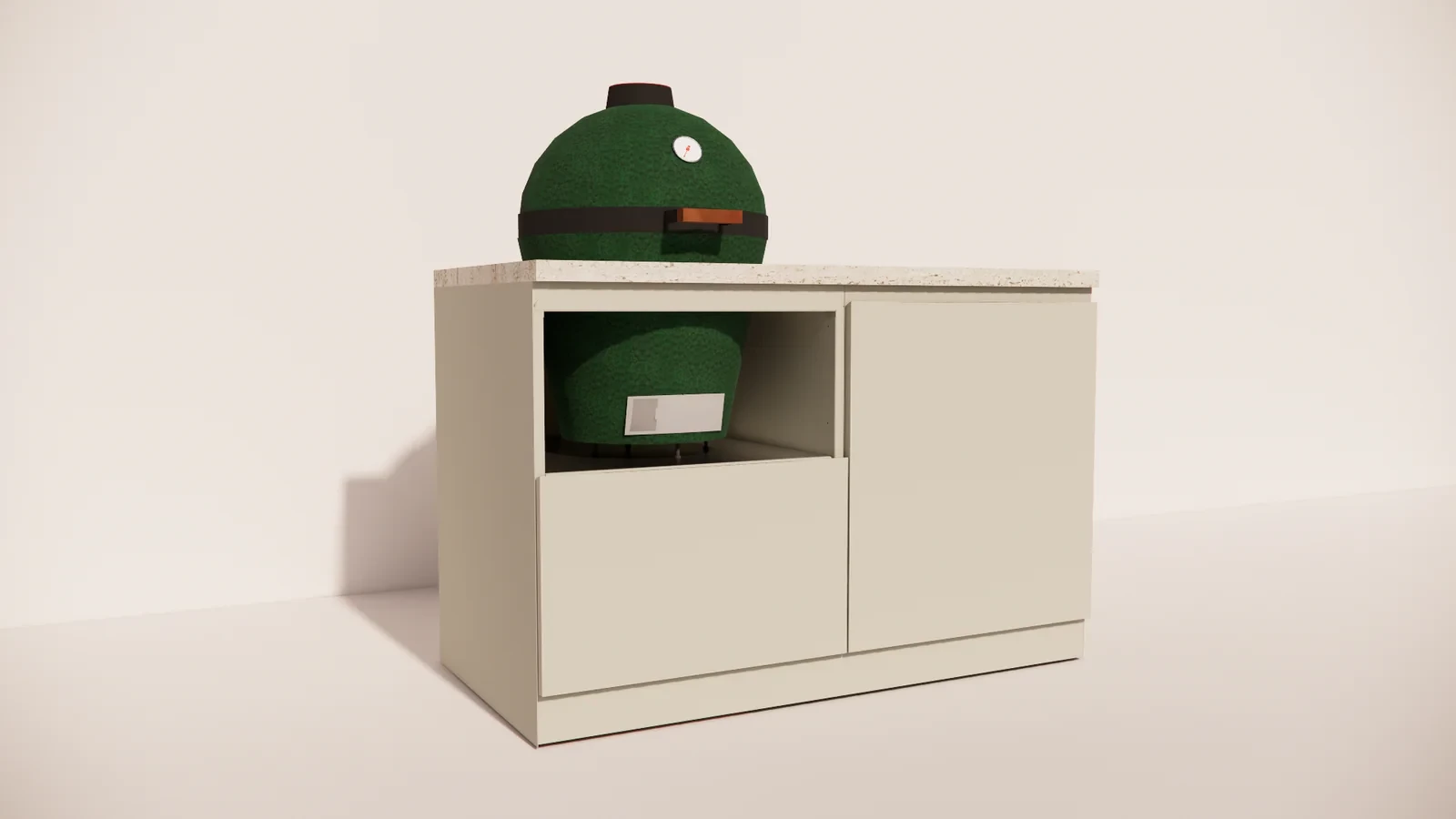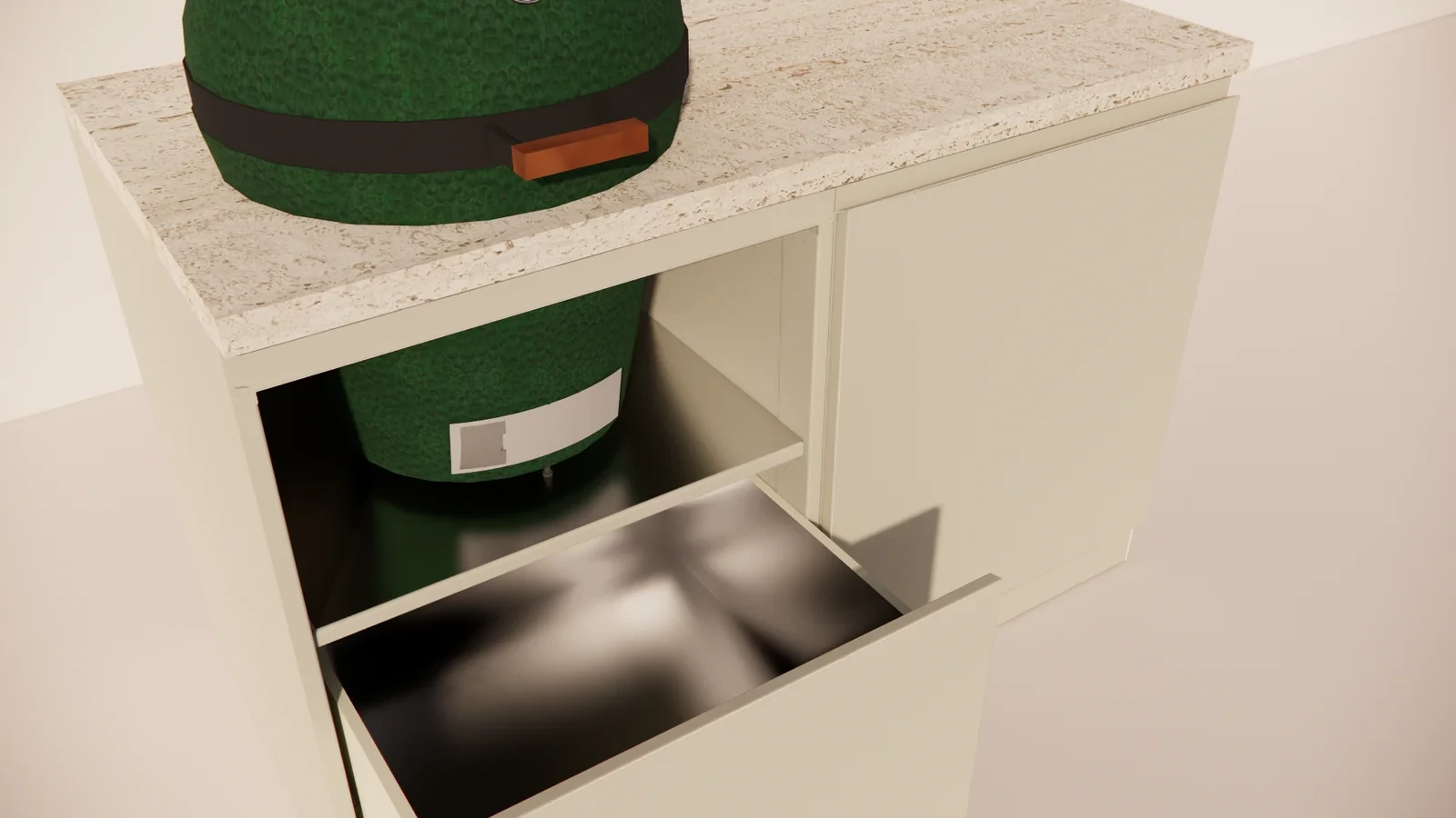 Die Marmorio-Arbeitsplatte verleiht der Outdoor-Küche ein luxuriöses Aussehen und ist hitze-, feuchtigkeits- und widerstandsfähig gegen starke Beanspruchung. Der integrierte Kamado bietet unvergleichliche Vielseitigkeit: Grillen, Backen, Räuchern oder Schmoren – alles ist mit derselben Präzision und gleichmäßigen Temperaturregelung möglich.