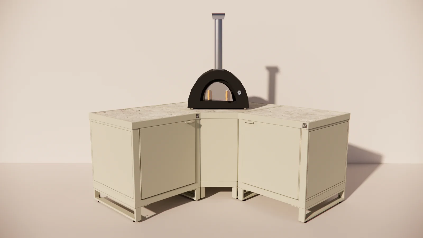 Der Eckrahmen bildet das Herzstück des Designs und bietet ausreichend Platz für einen großen Kamado- oder Pizzaofen von Marken wie Gozney, Alfa oder Ooni. Die beiden Rubix Single-Module bieten zusätzliche Arbeits- und Staufläche und machen diese Outdoor-Küche nicht nur praktisch, sondern auch optisch harmonisch.