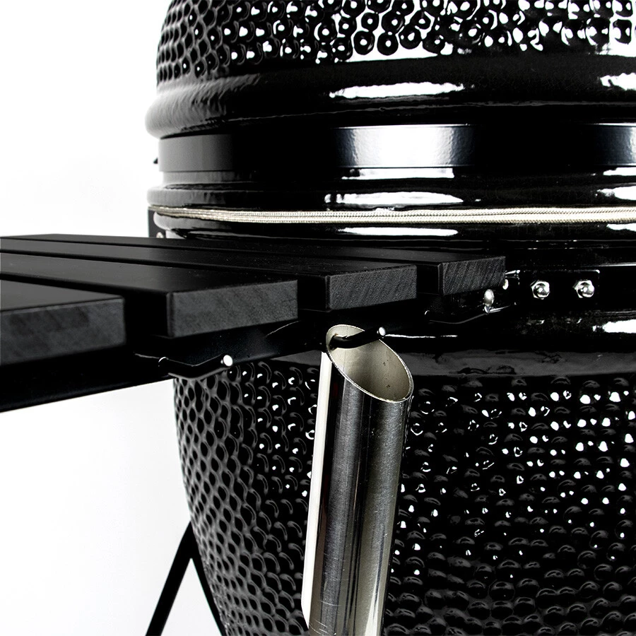 De LARGE YAKINIKU Kamado Black Edition wordt geleverd met diverse handige functies die je kookervaring verbeteren. Zo heeft dit model een luchtdichte ingang in de dome, waardoor je tijdens het grillen rookhout kunt toevoegen met behulp van de Woodchipper, zonder warmte te verliezen. Let op: de LARGE Kamado wordt geleverd zonder Woodchipper, deze dien je apart aan te schaffen. Dankzij het geïntegreerde scharniermechanisme kun je de deksel moeiteloos openen en sluiten, waardoor je eenvoudig bij je gerechten kunt. De nauwkeurige luchtregeling zorgt voor optimale controle over de temperatuur, terwijl de ingebouwde thermometer je helpt om de perfecte gaarheid van je gerechten te bereiken. Daarnaast zijn er handige zijtafels voor extra werkruimte.