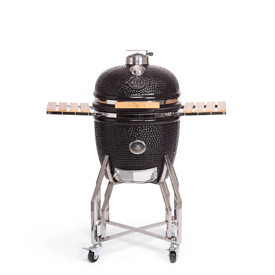 Der GROSSE Kamado wird mit einem Aschenkasten und einem Kohlekorb zum einfachen Entfernen von Asche und Holzkohle geliefert. YAKINIKU® Kamados bieten nicht nur höchste Qualität, sondern verleihen jeder Outdoor-Küche Luxus. Die Grillfläche kann mit einem zusätzlichen erhöhten Rost (nicht im Lieferumfang enthalten) erweitert werden, sodass Sie 70 % mehr Platz haben. Die einzigartige Öffnung im Kamado macht jede Mahlzeit zu einem Geschmackserlebnis. Mit dem Holzhacker fügen Sie Räucherholz ohne Wärmeverlust hinzu und die doppelte Isolierung sorgt für eine sichere Nutzung. Der Luftschieber mit präzisen Luftlöchern an der Unterseite sorgt für eine präzise Temperaturkontrolle.