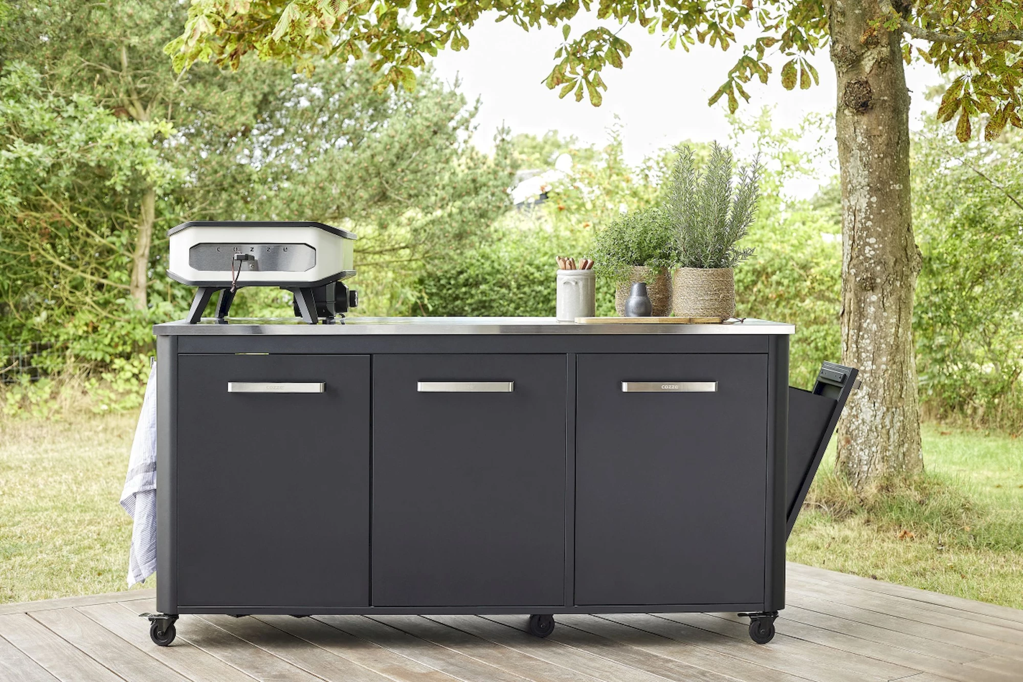 Die geräumige Arbeitsplatte aus Edelstahl und die zahlreichen Aufbewahrungsmöglichkeiten sorgen dafür, dass alle Ihre Kochutensilien griffbereit sind. Nicht nur praktisch, sondern auch eine ästhetische Bereicherung für Ihren Garten, denn mit seinem beeindruckenden Design und der praktischen Integration eines Abfallbehälters bleibt Ihr Kochbereich stets organisiert. Mit einer Länge von 180 cm bietet dieser Tisch viel Platz zum Kochen und Zubereiten und ist somit eine unverzichtbare Bereicherung für jede Outdoor-Küche.