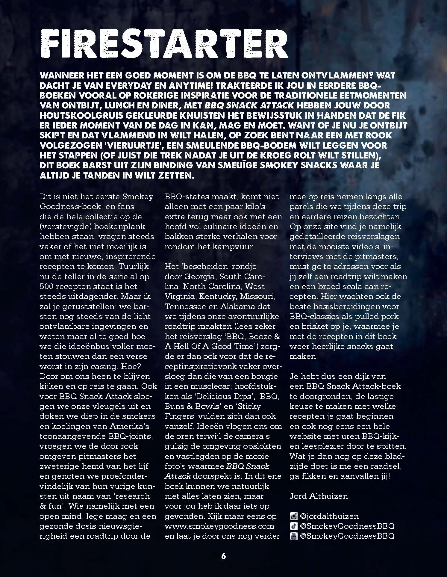 Met Smokey Goodness BBQ Snack Attack, het tiende deel in de populaire Smokey Goodness-serie, bewijst pyro-culinair avonturier Jord Althuizen dat het altijd tijd is voor een BBQ. Of je nu een vlammend ontbijt wilt, een met rook gevulde lunch, of een stevige snack na een avondje stappen, dit boek staat vol met de lekkerste BBQ-snacks.