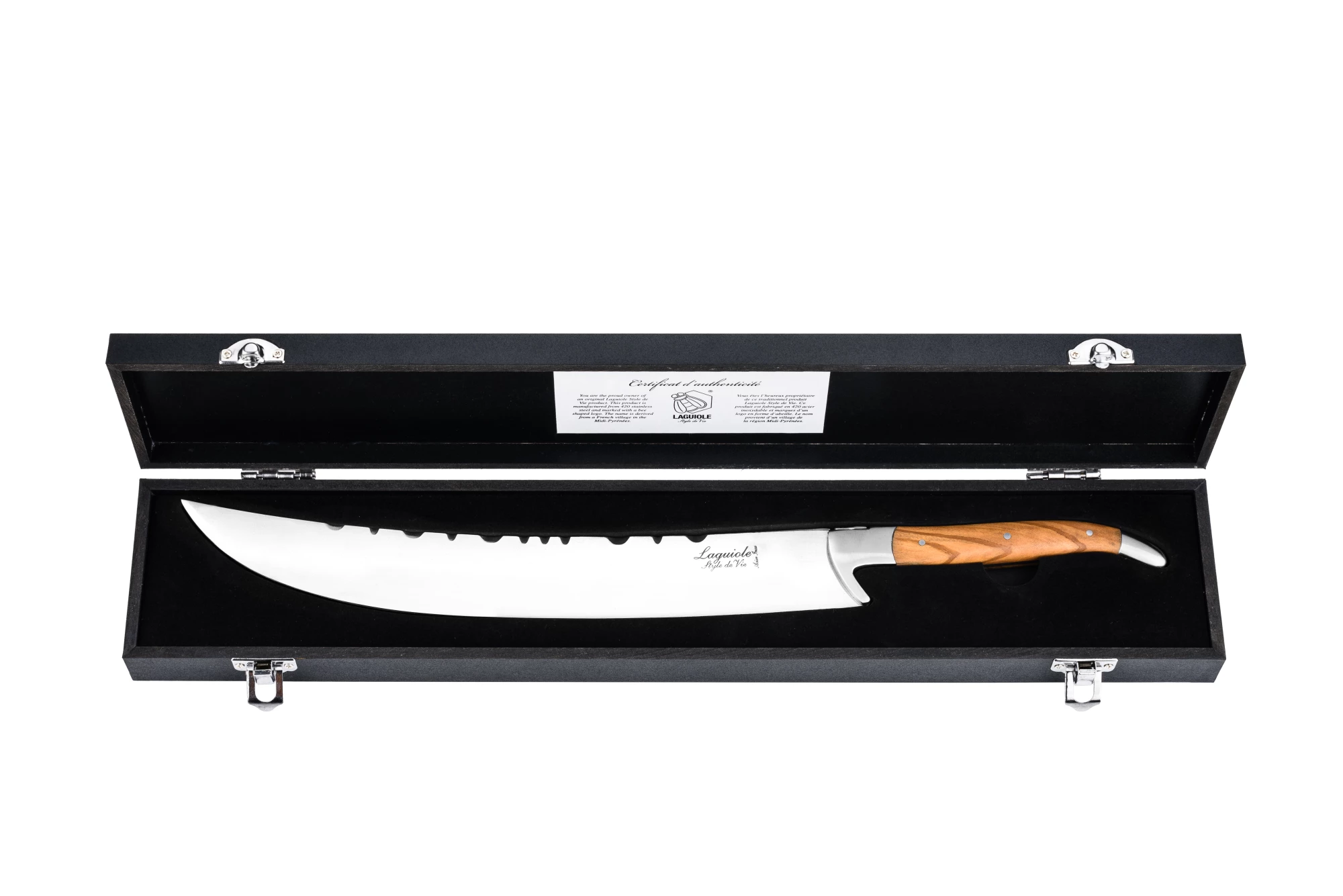 Met de Laguiole Style de Vie Luxury Line Champagnesabel Olijfhout maak je van elke toast een bijzonder moment. Deze elegante sabel combineert ambacht, stijl en functionaliteit in één exclusief ontwerp. Het geharde stalen lemmet (2,5 mm dik) zorgt voor een krachtige en vloeiende sabreerbeweging, terwijl het handvat van echt olijfhout niet alleen een luxe uitstraling biedt, maar ook prettig in de hand ligt.
