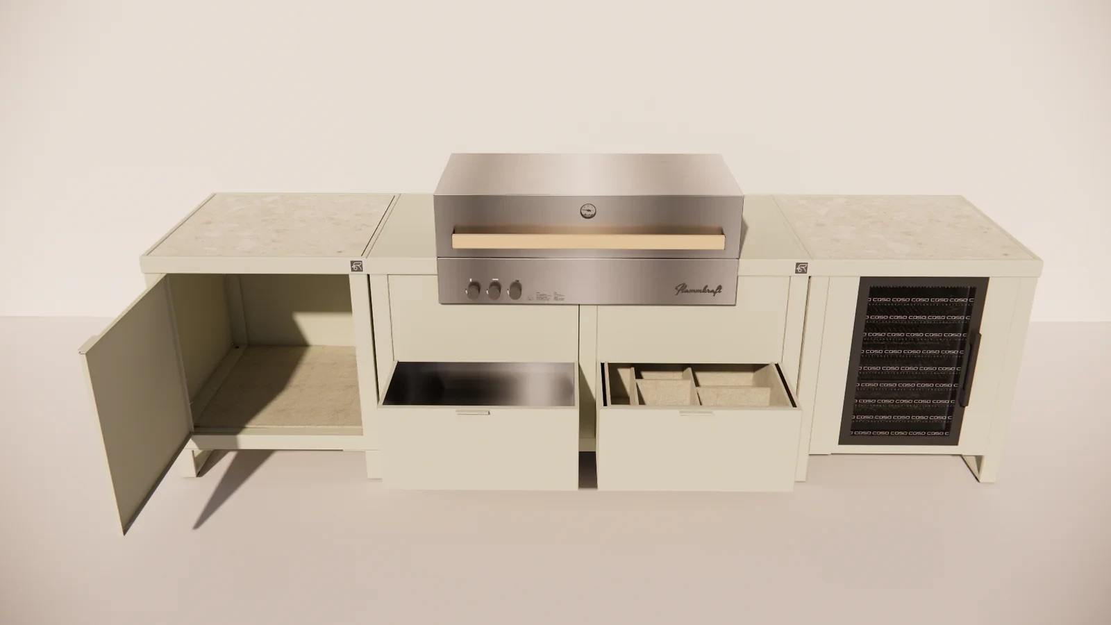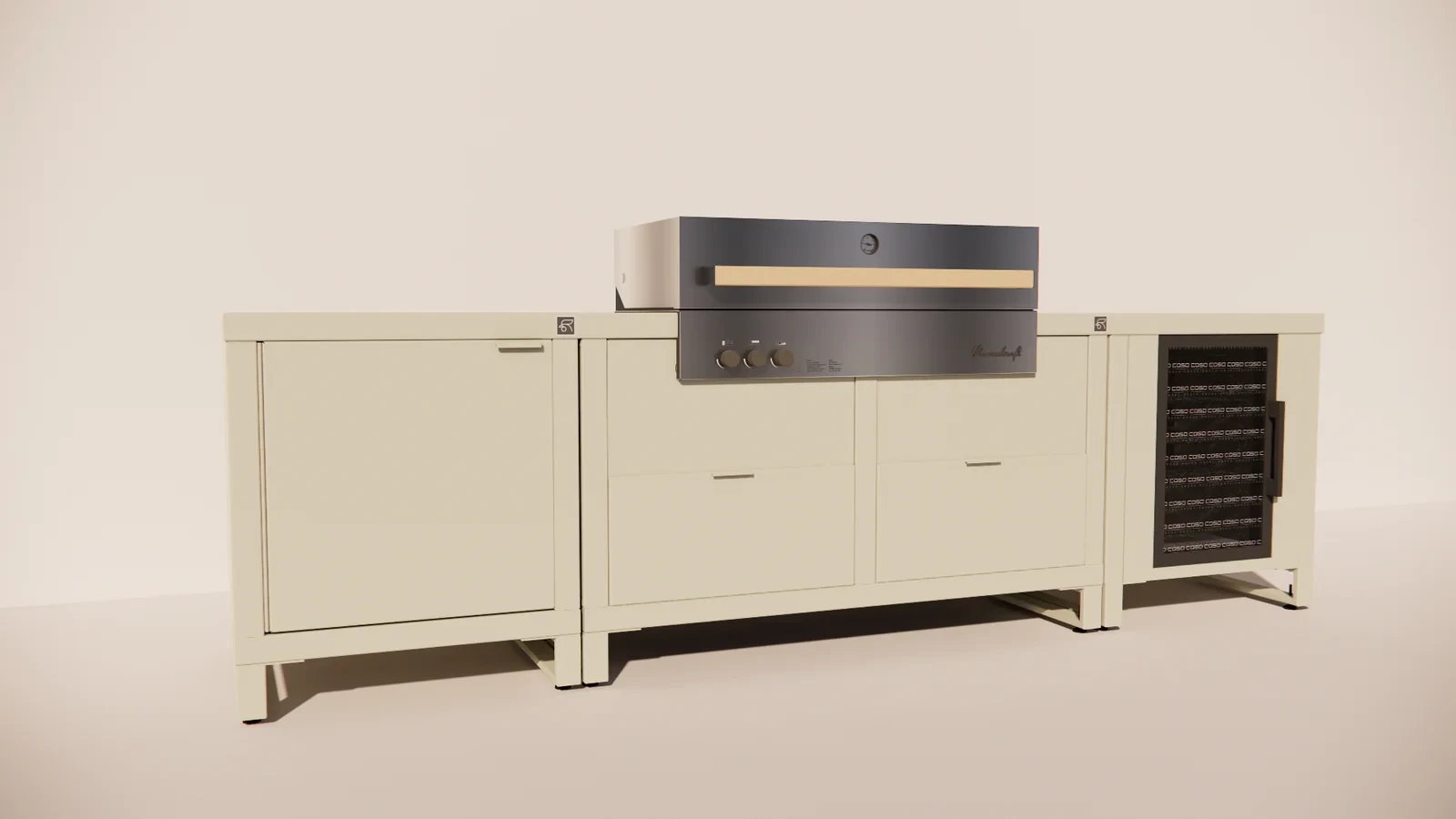 Dankzij het symmetrische ontwerp en de hoogwaardige afwerking straalt de opstelling rust, luxe en professionaliteit uit. De gebruikte materialen zijn weerbestendig, onderhoudsarm en ontworpen voor langdurig buitengebruik. Zo geniet je jarenlang van stijlvol en comfortabel buiten koken.