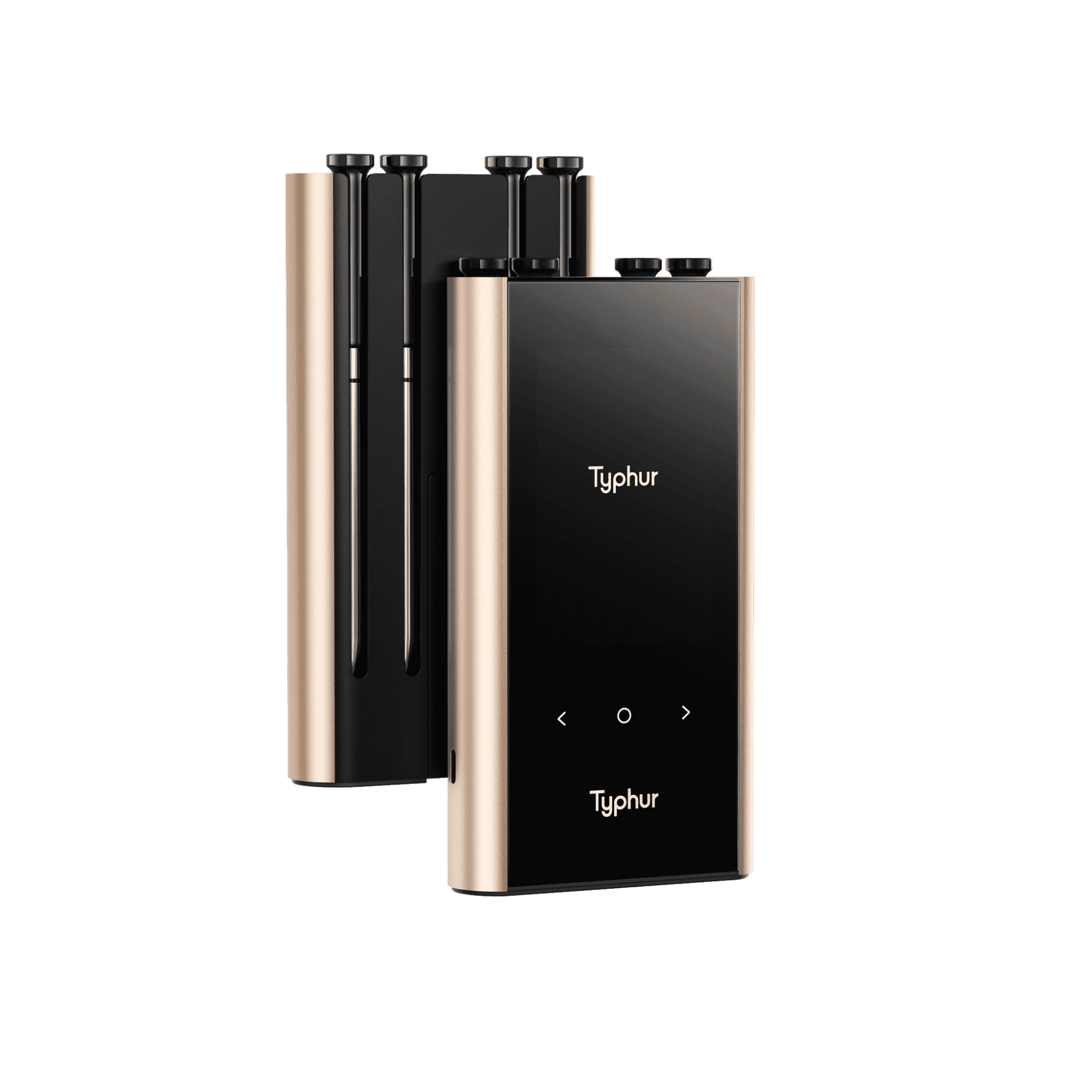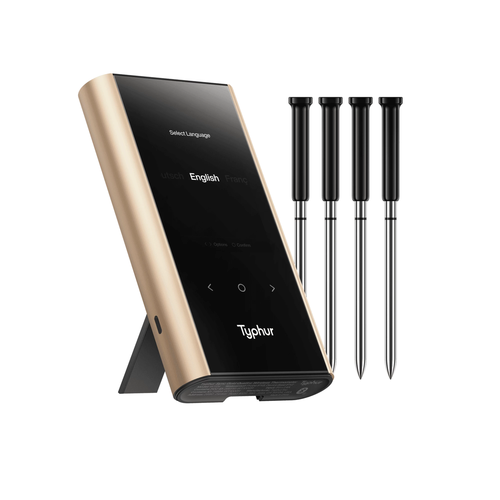 Das Typhur Sync Gold Quad wurde für Grillmeister und Outdoor-Köche entwickelt, die absolute Kontrolle über Temperatur und Garzeit wünschen. Dieses fortschrittliche, kabellose Fleischthermometer verfügt über vier hochwertige Sonden mit jeweils sechs Sensoren. Fünf Sensoren messen die Kerntemperatur in verschiedenen Tiefen, während ein Sensor kontinuierlich die Umgebungstemperatur aufzeichnet. So erhalten Sie einen äußerst präzisen und zuverlässigen Überblick über den gesamten Garvorgang.