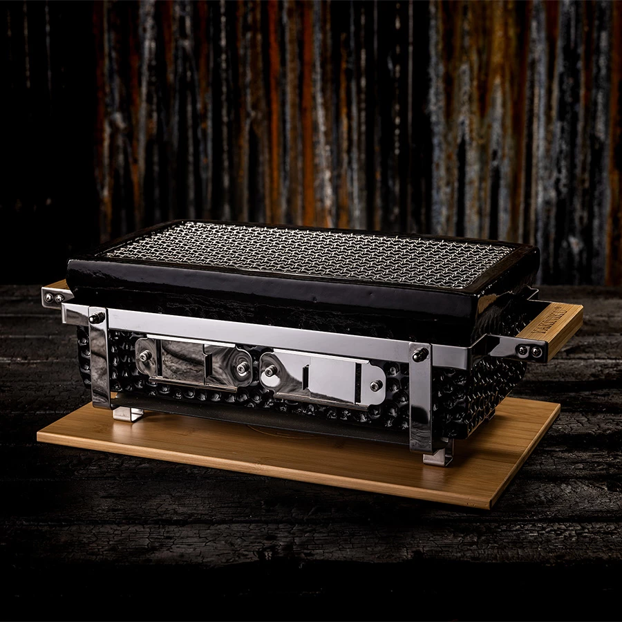 Sind Sie bereit, Ihre Grillfähigkeiten zu verbessern? Dann entscheiden Sie sich für den Konro & Yakitori Grill! Dieser rechteckige Shichirin bietet eine geräumige Grillfläche von 39 x 21 cm, perfekt zum Braten kleiner oder großer Fleischstücke. Dank der Lüftungsschieber kann der Shichirin problemlos hohe Temperaturen erreichen und das Fleisch gleichmäßig grillen.