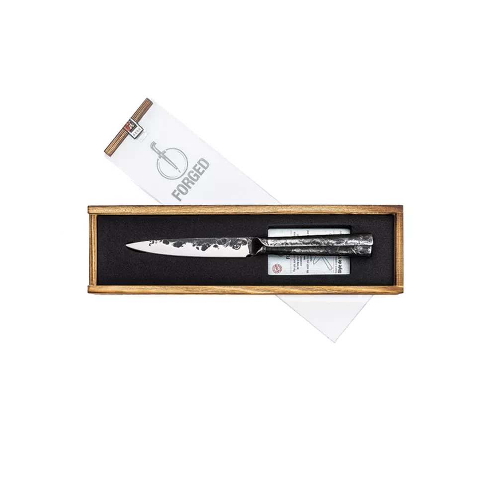 Das Forged Brute Universalmesser, eine kompakte Version des Kochmessers, eignet sich ideal zum präzisen Schneiden von Gemüse oder kleinen Fleischstücken. Die schmale Klinge ermöglicht präzises Arbeiten. Hergestellt aus japanischem 440C-Stahl mit einer Härte von 58 Rockwell, handgeschmiedet für Einzigartigkeit. Das Messer hat eine Klingenstärke von 2 mm und einen Schnittwinkel von 18 Grad. Verpackt in einer luxuriösen Holzkiste und mit 10 Jahren Garantie. Entdecken Sie die Vielseitigkeit und Langlebigkeit des Forged Brute Universalmessers in jeder Küche.