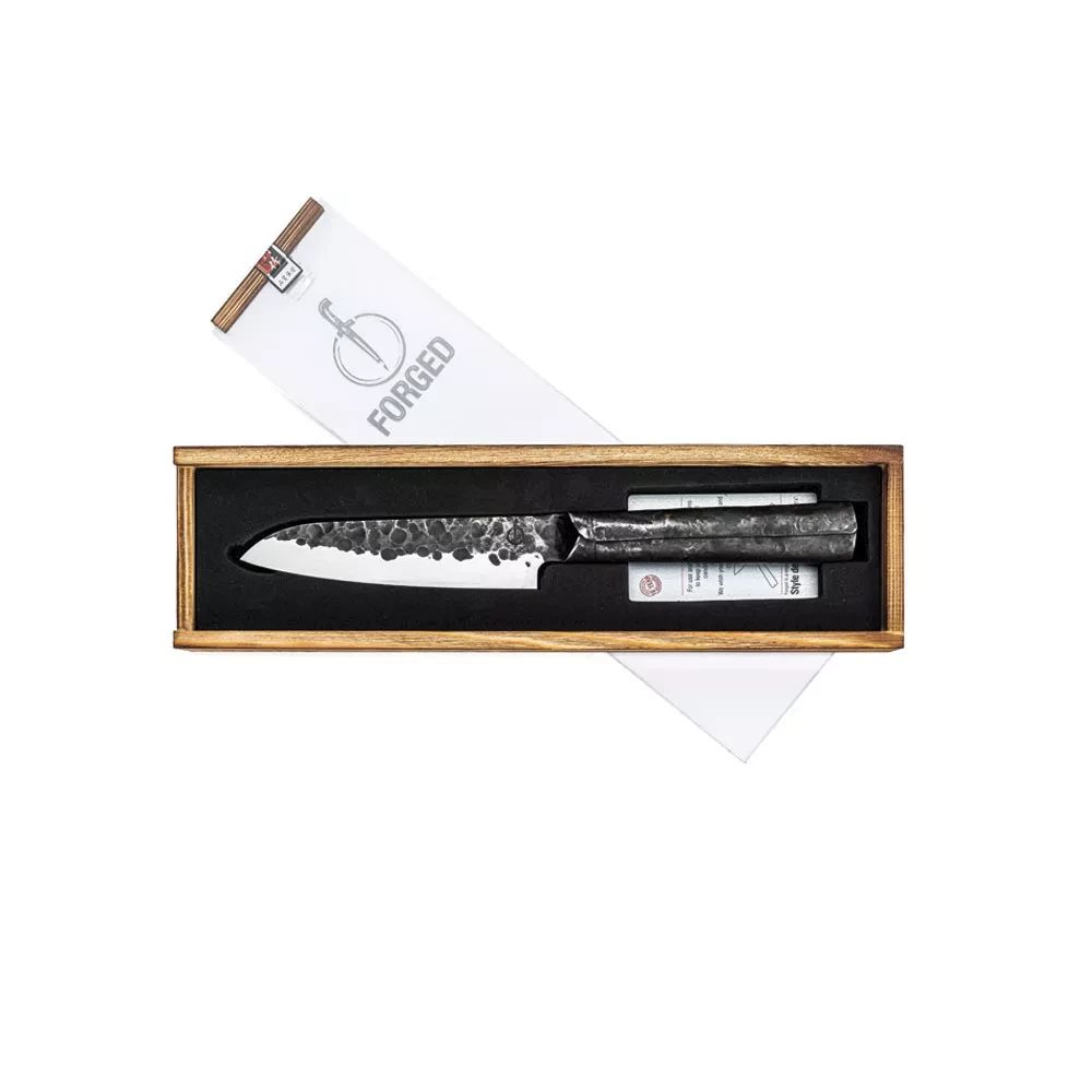 Entdecken Sie das 14 cm lange Forged Brute Santokumesser, die japanische Interpretation des Kochmessers. Das Wort „Santoku“, was „drei Tugenden“ bedeutet, unterstreicht seine Vielseitigkeit: Schneiden, Hacken und feines Schneiden. Ein Allrounder in der Küche. Jedes Messer besteht aus japanischem 440C-Stahl mit einer Härte von 58 Rockwell und ist handgeschmiedet, um ihm einen einzigartigen Charakter zu verleihen. Die Klinge hat eine Stärke von 2 mm und einen Schnittwinkel von 18 Grad. Das 14 cm lange Brute-Santokumesser wird in einer luxuriösen Holzbox geliefert und bietet eine 10-jährige Garantie. Erleben Sie die gleiche Vielseitigkeit in einer 18-cm-Variante. Entdecken Sie bei jedem Schnitt die Qualität von Forged Brute.