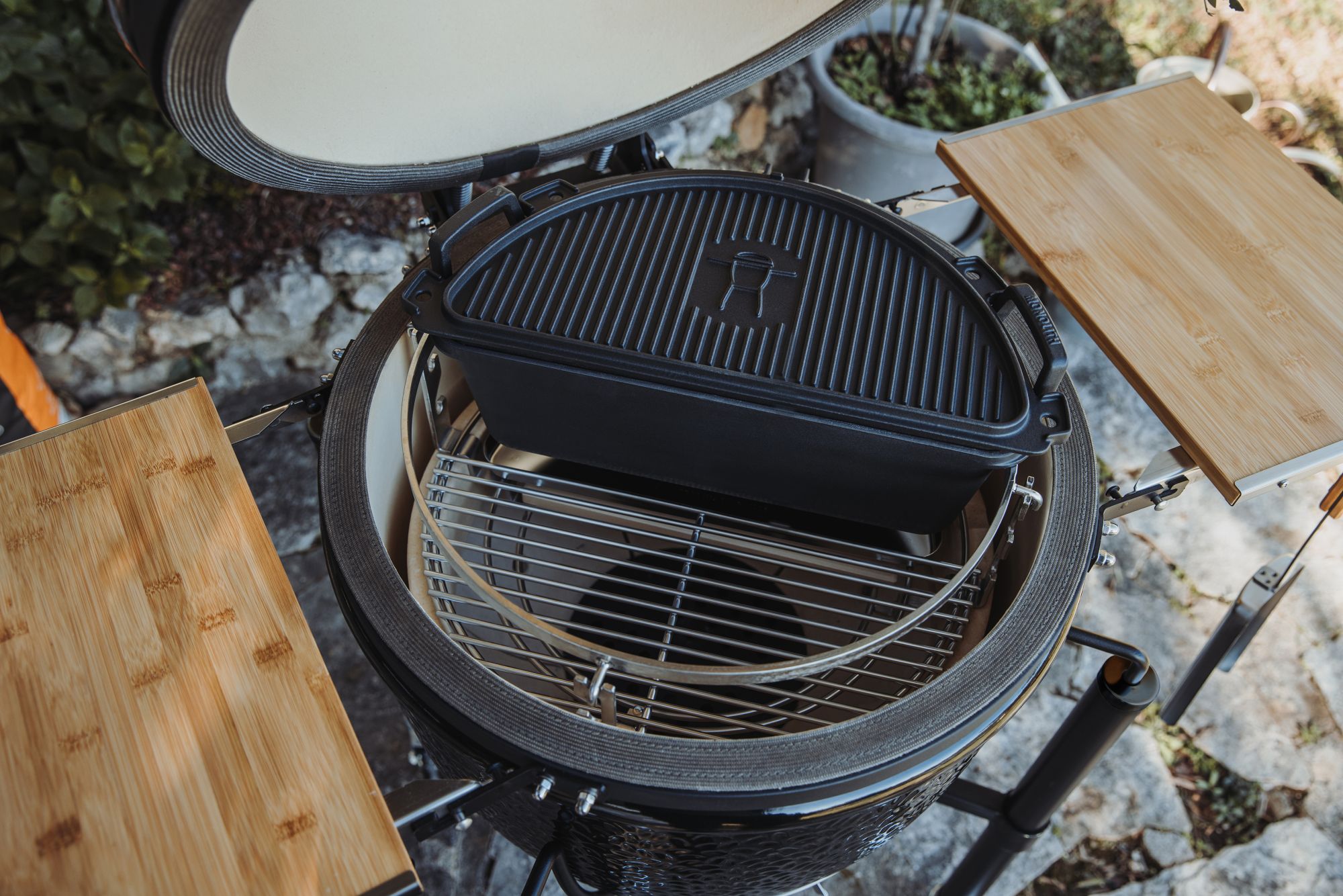 Mit dem Smart Grid System kombinieren Sie direktes und indirektes Grillen, ohne Ihren Kamado umzubauen. Auf der einen Seite grillen Sie über offener Glut für intensive Hitze und eine schöne Kruste. Auf der anderen Seite schaffen Sie mit einem Deflektorstein eine geschützte Zone mit sanfter, gleichmäßiger Hitze.