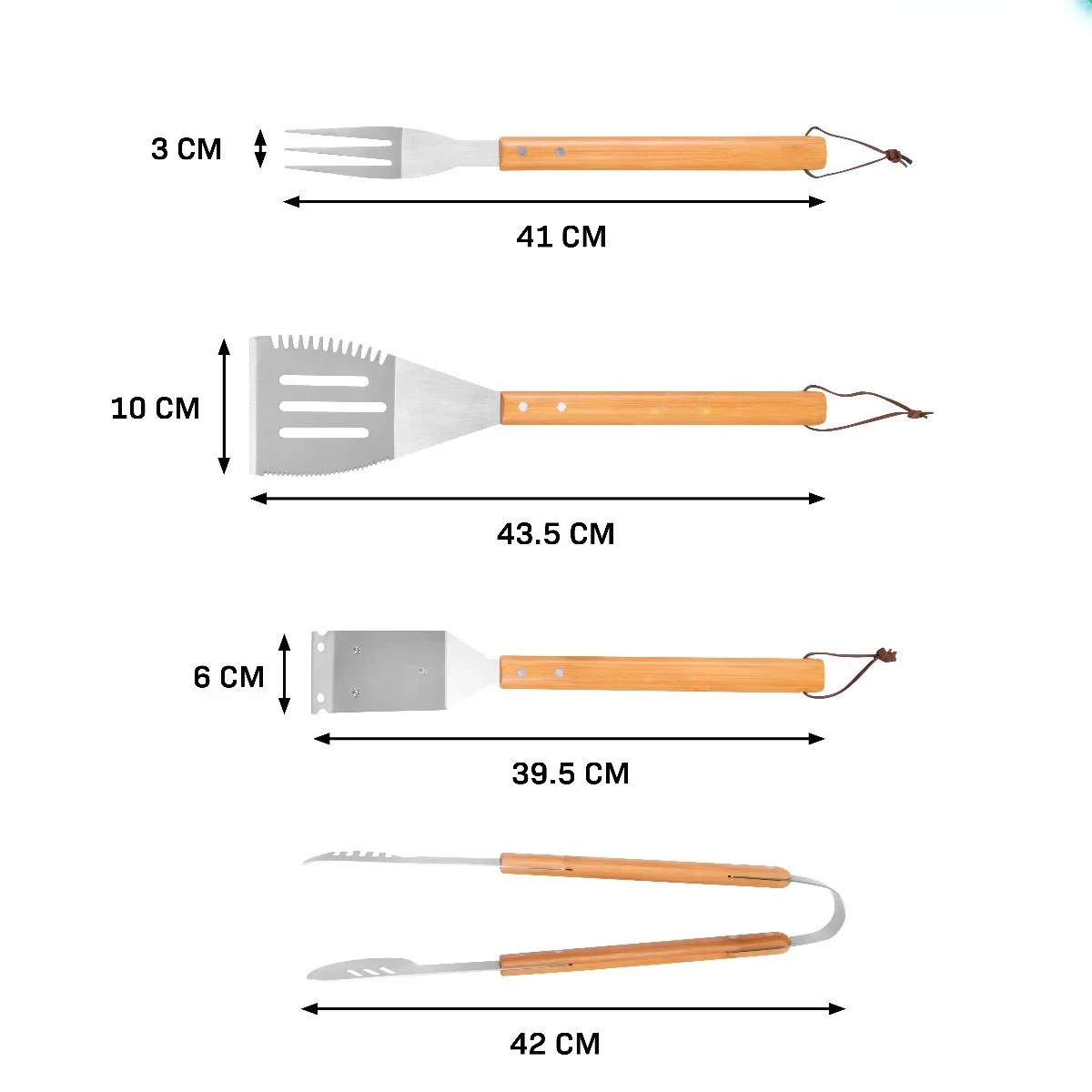 De BBQ Tool Set biedt alles wat je nodig hebt voor een geslaagde barbecuesessie. De tools zijn gemaakt van hoogwaardig roestvrij staal en voorzien van stijlvolle bamboe handvatten, waardoor ze prettig in de hand liggen en uitstekend bestand zijn tegen hitte en vocht. Met een lengte van ongeveer 40 cm werk je veilig op afstand van de grill, zonder in te leveren op controle of precisie.