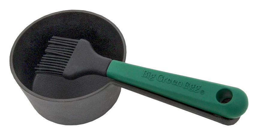 De Big Green Egg Gietijzeren Sauspan met Kwast is de perfecte set voor het bereiden en serveren van warme sauzen, glazes of marinades tijdens het barbecueën. De pan is gemaakt van massief gietijzer, wat zorgt voor een uitstekende warmteverdeling én langdurig warm houden van de inhoud – ook als je de pan van het rooster haalt en op tafel zet.