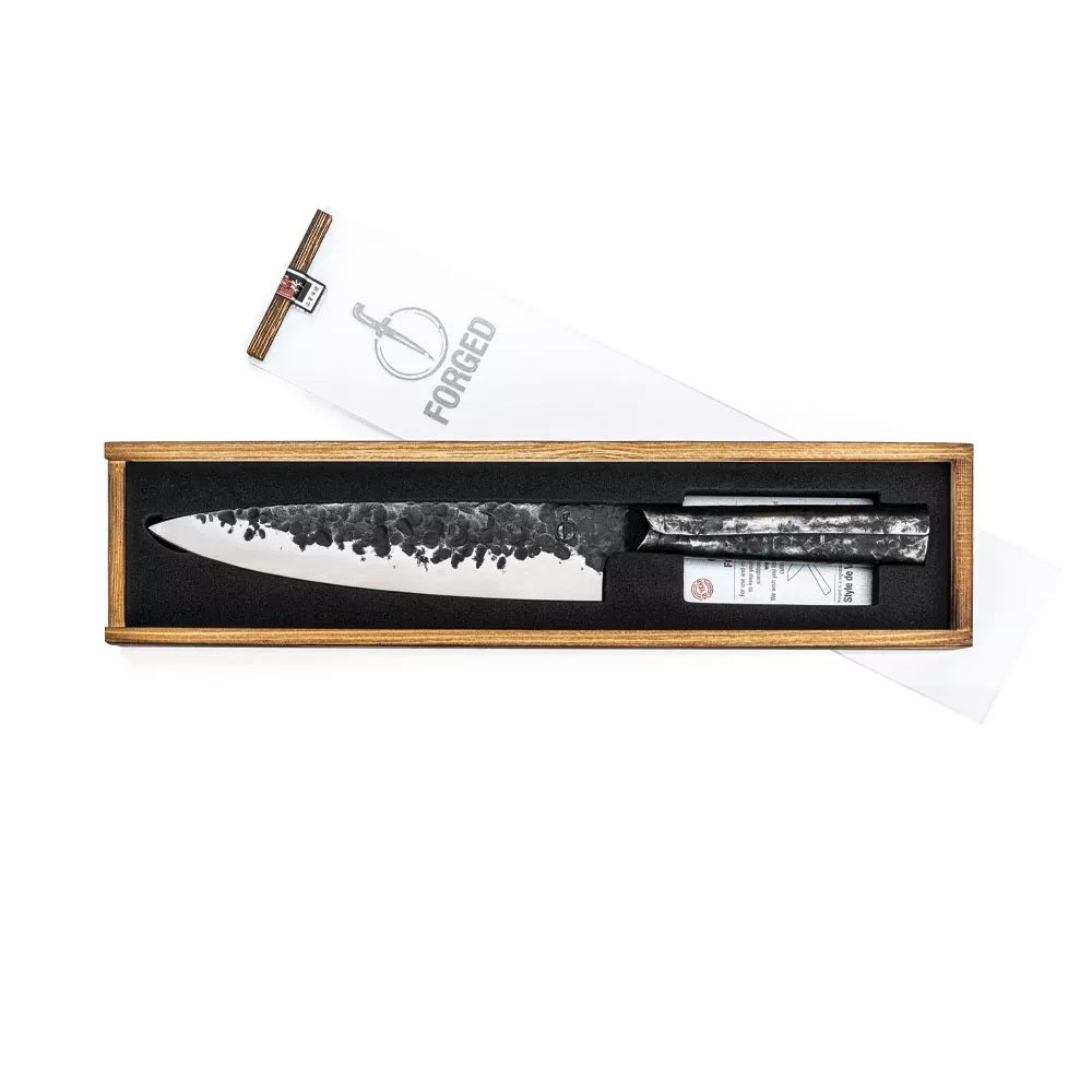 Entdecken Sie die beispiellose Vielseitigkeit des Forged Brute Kochmessers, ein unverzichtbares Werkzeug für jeden (Hobby-)Koch. Dieses Messer eignet sich perfekt zum präzisen Schneiden von Fleisch, Fisch, Gemüse und zum Hacken von Kräutern. Das unverwechselbare Klingendesign ist von der europäischen Küche inspiriert.