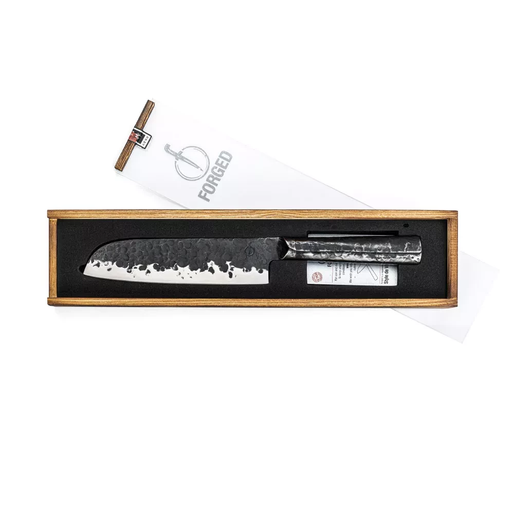 Dieses geschmiedete Santoku-Messer ist ein echter Alleskönner in der Küche und ein Blickfang auf der Arbeitsfläche. Perfekt für Hobbyköche, die Wert auf Qualität und Charakter legen, aber auch bestens geeignet für den professionellen Einsatz.
