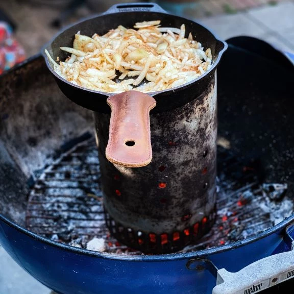 Eine bekannte Eigenschaft von Gusseisen ist seine Fähigkeit, Wärme über lange Zeiträume zu speichern. Valhal Outdoor hat die Hülle entwickelt, um das Kochen mit einer Gusseisenpfanne zu erleichtern. Dieser Lederbezug, der unter anderem für die Griffe von Bratpfannen entwickelt wurde, behält den robusten Charakter der Pfanne. Obwohl die Griffabdeckung perfekt für Valhal Outdoor-Pfannen geeignet ist, ist sie für jede Pfanne mit einem vergleichbaren Griff geeignet. Der aus Leder gefertigte Bezug wird mit der Zeit flexibler und passt sich dem Griff der Pfanne an. Die Verwendung ist einfach: Schieben Sie ihn um den Griff, wenn Sie die Pfanne aufnehmen. Lassen Sie es jedoch nicht bei hohen Kochtemperaturen stehen. Die Hülle kann während der Lagerung an ihrem Platz bleiben und das Design verfügt sogar über ein Loch zum Aufhängen. Regelmäßiges Fetten, zum Beispiel mit VH.WAX von Valhal Outdoor, hält die Hülle in optimalem Zustand und verleiht dem Leder mit der Zeit eine charakteristische dunkle Farbe.