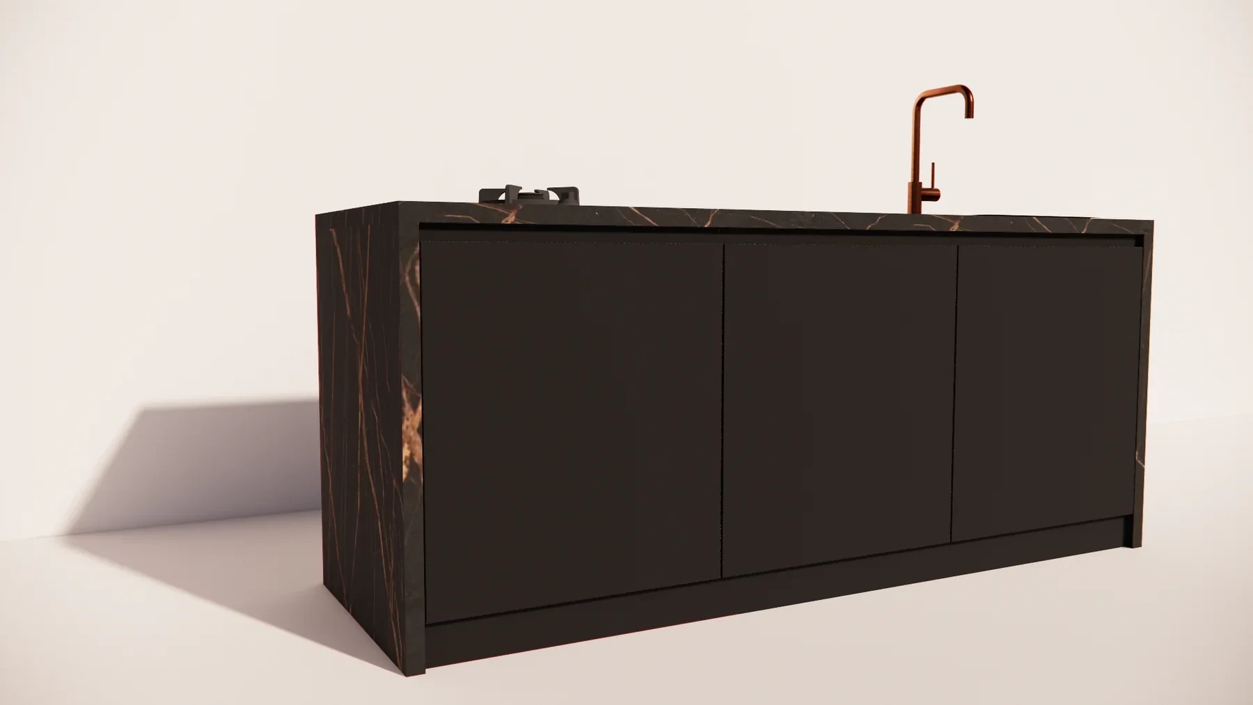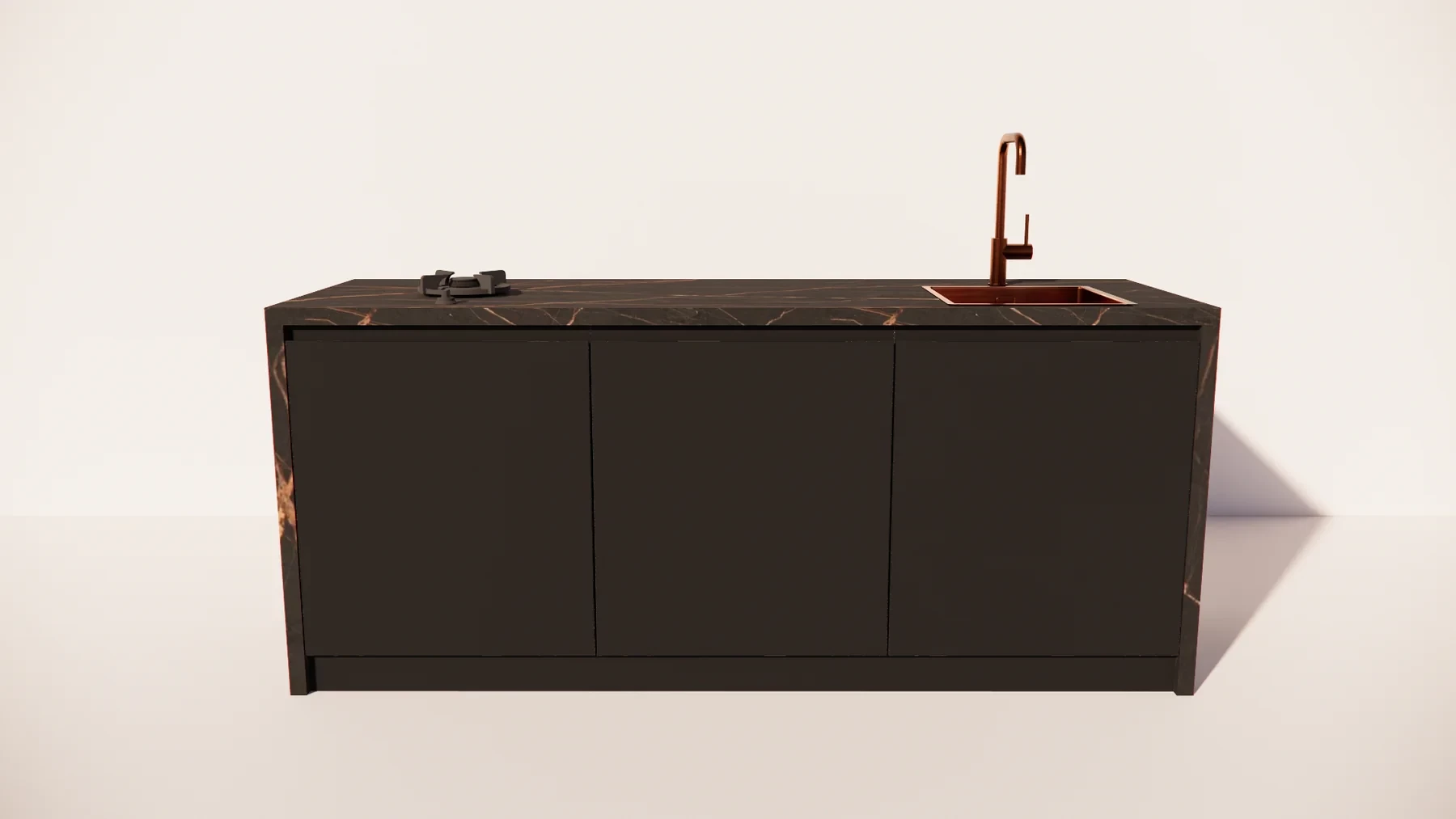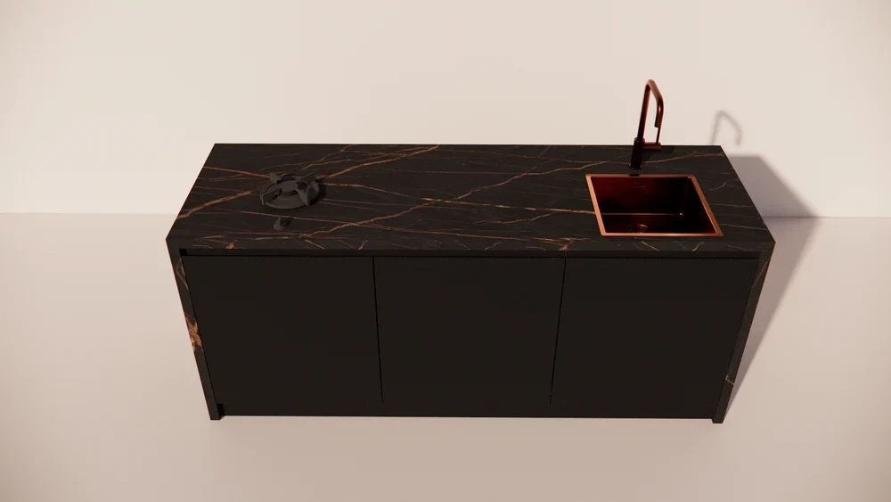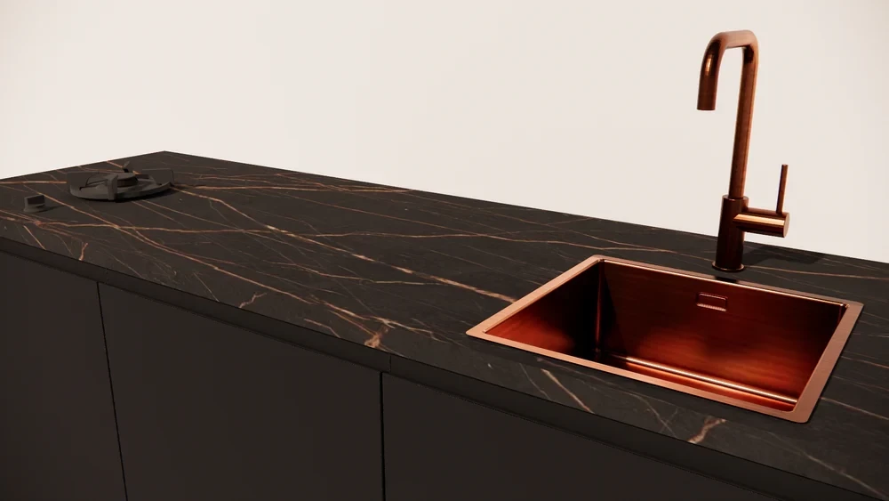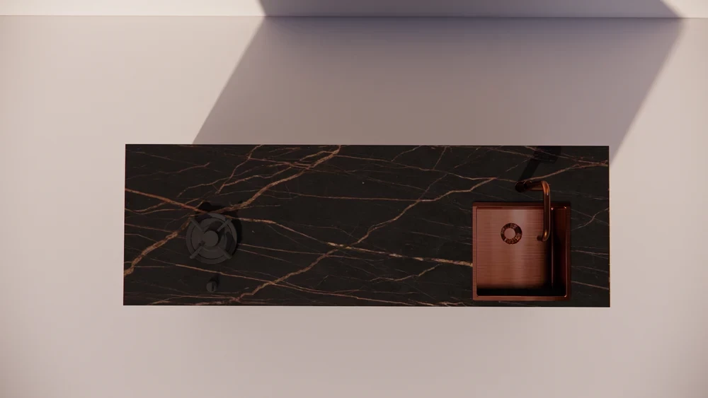 Der Pitt Cooking-Kochherd ist nahtlos in die Arbeitsplatte integriert und bietet starke Leistung in minimalistischem Design. Die Spüle sorgt für praktischen Komfort beim Kochen und Reinigen, während die Laurent-Arbeitsplatte mit ihrer dunklen, marmorähnlichen Textur für ein luxuriöses Ambiente sorgt.