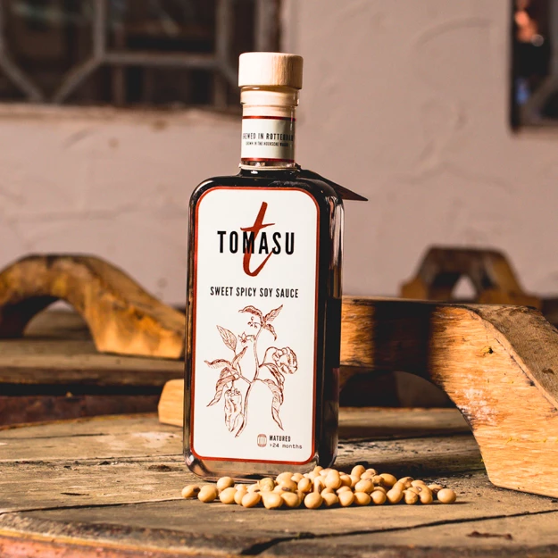 Entdecken Sie die einzigartige, handwerklich hergestellte Tomasu Sojasauce – die einzige ihrer Art in Europa. Die von Thomas Uljee gegründete Sojasauce stammt aus Rotterdam und bietet ein reichhaltiges und unverwechselbares Geschmackserlebnis. Nach jahrhundertealten japanischen und niederländischen Traditionen wird sie mindestens 24 Monate lang in schottischen Whiskyfässern fermentiert und gereift. Lokale Zutaten wie sorgfältig angebaute Sojabohnen und Weizen, kombiniert mit Quellwasser und grauem Meersalz aus der Bretagne, ergeben ein hochwertiges Produkt. Die Verwendung des einheimischen Pilzes Aspergillus oryzae tomasu und die lange Reifezeit verleihen ihr einen delikaten, tiefen und subtilen Geschmack.