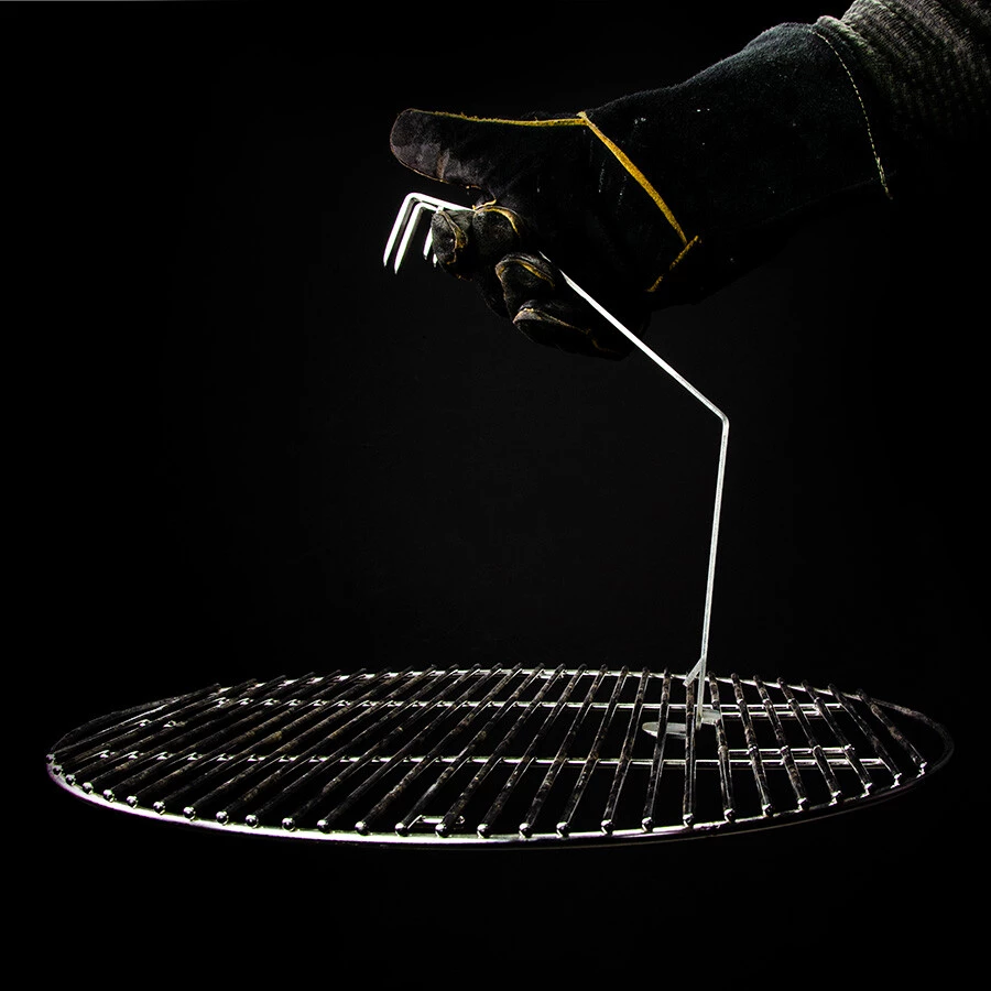 Waarom is de Gridlifter zo belangrijk? Ten eerste biedt het veiligheid door je handen te beschermen tegen de intense hitte van je Kamado, terwijl het handvat koel blijft. Ten tweede is het ongelooflijk handig bij het verwijderen van het rooster voor bijvoorbeeld het bijvullen van houtskool of het toevoegen van rookhout. Met de Gridlifter heb je het rooster in een handomdraai omhoog. Ten derde maakt het de reiniging na een smakelijke grillavond een fluitje van een cent. Til het rooster eruit, schraap de resten weg en je bent klaar voor je volgende barbecue-avontuur. De Gridlifter zelf reinig je eenvoudig met een RVS-reiniger of je legt de lifter in de vaatwasser.