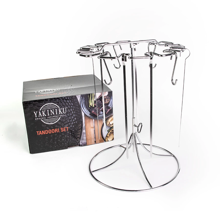 Der Tandoori-Halter ist höhenverstellbar und für den Einsatz im XXLARGE, XLARGE, LARGE und MEDIUM Kamado geeignet. Dieses aus Edelstahl gefertigte Set ist vollständig spülmaschinenfest.