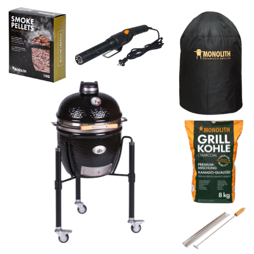 Mit dem leistungsstarken Mono-Anzünder zünden Sie Ihren Grill schnell und sicher an. Die mitgelieferten 8 kg Monolith-Holzkohle sorgen für ein langes, gleichmäßiges Abbrennen, während die Buchenholz-Räucherpellets (1 kg) ein dezentes Raucharoma beisteuern. Ein passender Deckel für optimale Kontrolle beim Grillen rundet das Set ab.